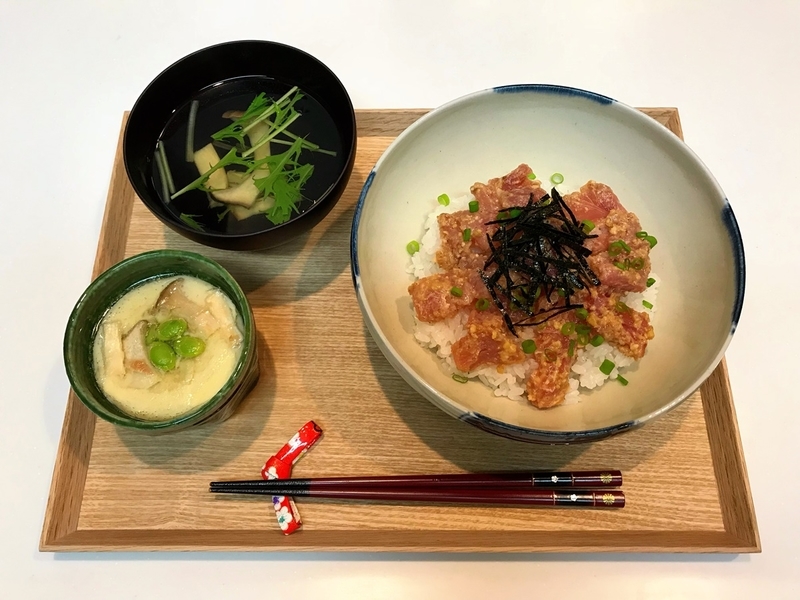 献立・一汁一菜 まぐろのごま味噌漬け丼+茶碗蒸し+すまし汁 - DJモペのねこまんま。