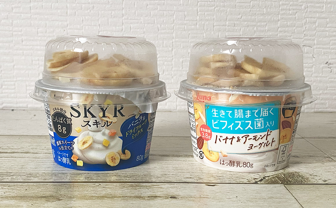 2023年10月2日 月 新商品 『スキル バニラ&ドライフルーツミックス』と『TOPCUP バナナ&アーモンド ヨーグルト』を食べ比べてみました!Foooood。