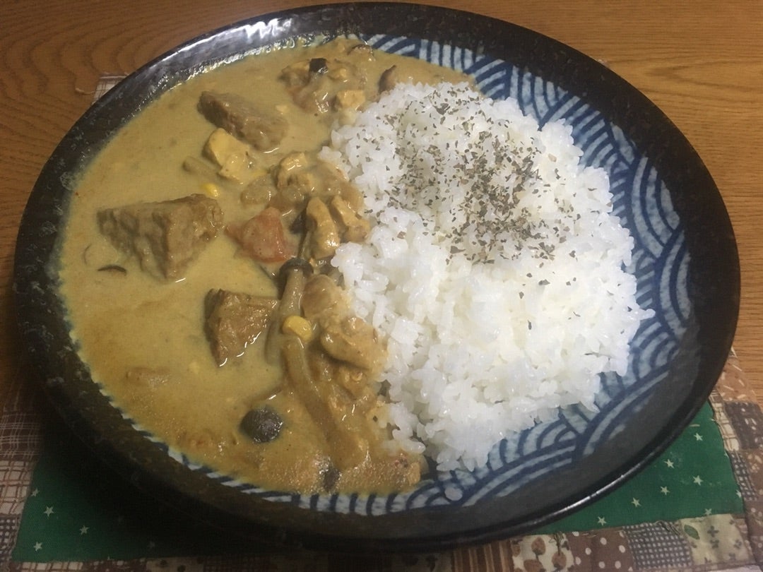 豆乳でまろやか!お手軽グリーンカレー : ベジタリアンミットゥンと肉食チャースケ。
