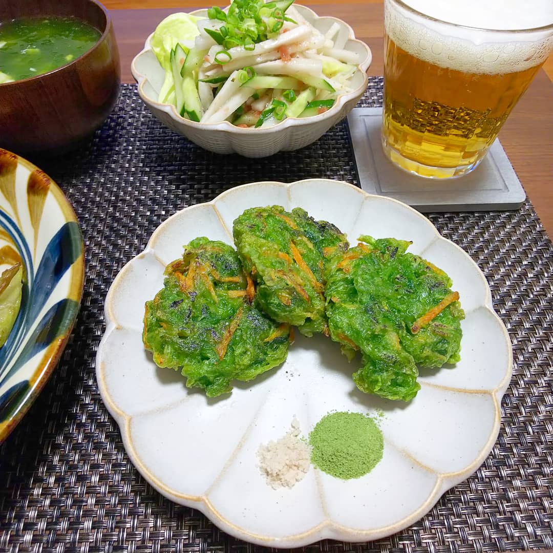 晩ごはん 沖縄の春の味覚、アーサ天ぷらアラフォーシングル男の自由気ままな沖縄ライフ。