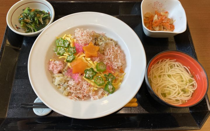 7月 七夕献立ちらし寿司、揚げ出し豆腐、そうめんサラダ、すいかをご用意しました🎋ペースト食も工夫し、多くのみなさんに食べてもらうことが出来ました。 初物のすいかは甘みがあり患者さんに好評でした🍉下伊那赤十字病院日本赤十字社日赤松川町下伊那郡。