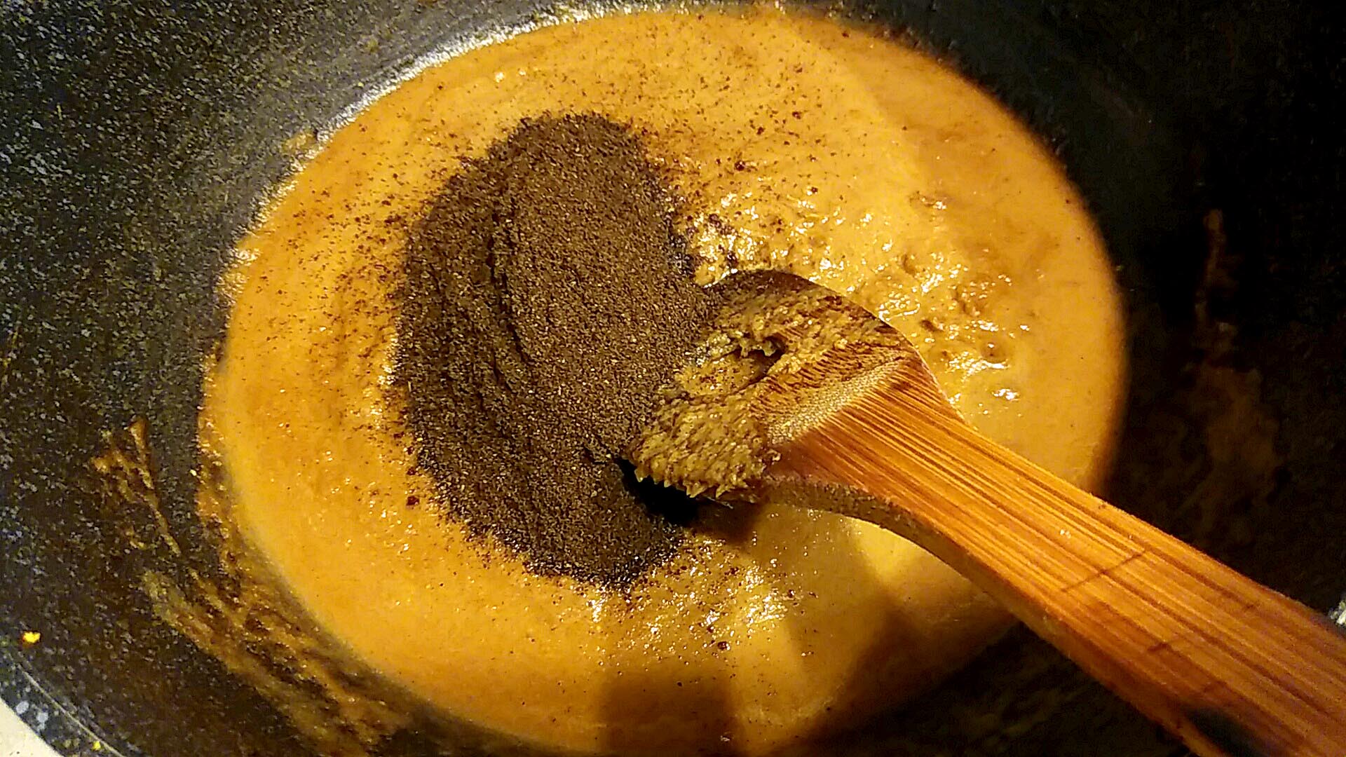 なぜ黒いの? スマトラカレー特徴の色。 黒褐色。 疑問に思われる方が多いようです。 コーヒーを入れてるから。 チョコを使ってるから。とネット上では様々な憶測が飛び交っていますが、 この黒褐色は スパイスを煎ることによって作り出されるものです。 スパイスを煎る。