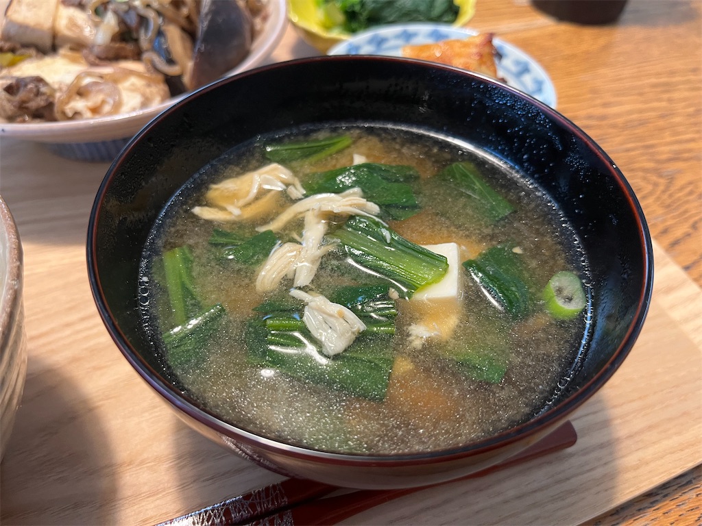 ごまの香りがふんわり。小松菜と鶏ささみの味噌汁 レシピ・有賀 薫さんファッション雑誌『リンネル』の読みもの。