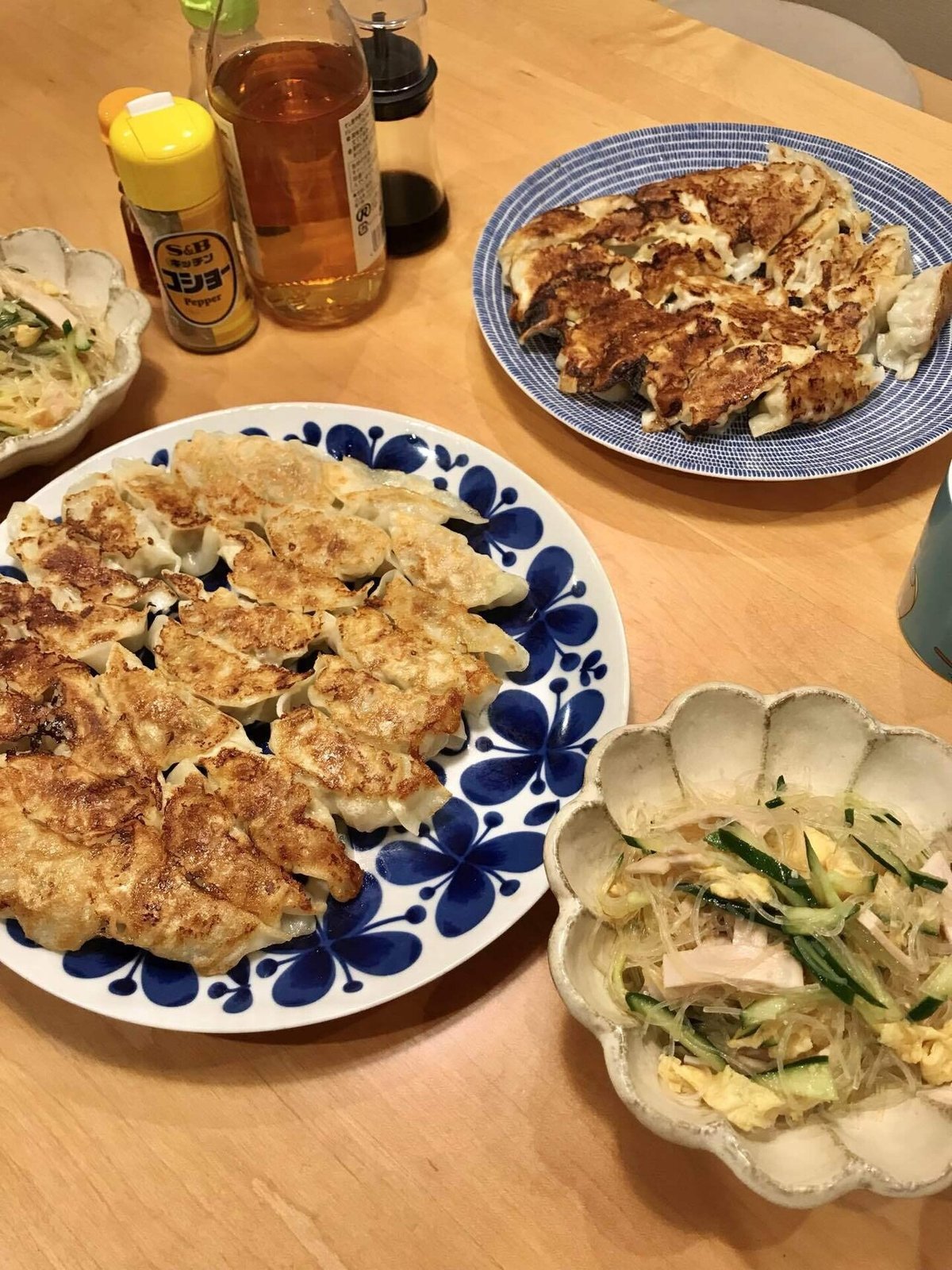 夜ご飯 📝 献立 *焼き餃子 *野菜スープ *ポテトサラダ *春雨サラダ *スイカ🍉 週末は久しぶりに餃子を作りました🥟子どもたちが包むのを手伝ってくれるようになって すごく助かる🥹 形は色々で、 焼売のようだったり、ヒダがなかったり、 中身が出ていたり、中身が。