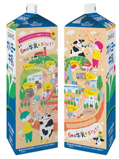 6月1日の「牛乳の日」に合わせた限定パッケージ つながるデザインのオハヨー牛乳を発売オハヨー乳業株式会社。