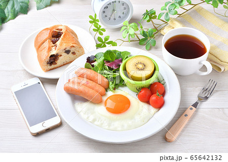 ワンプレート朝食 洋食、目玉焼き、ソーセージ のイメージ。レーズンパンとコーヒーとスマホと時計。の写真素材65642132- PIXTA。