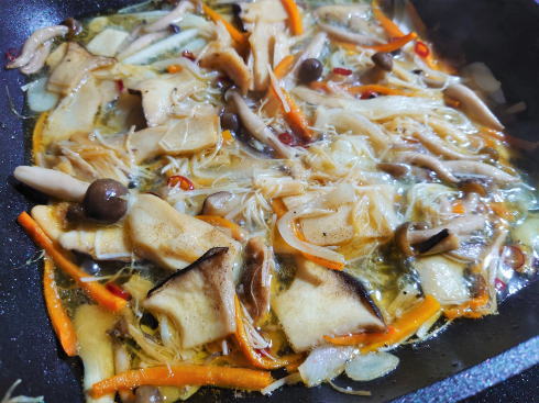 残ったオイルはパスタに♡えびとキノコ類のアヒージョ。