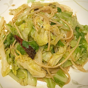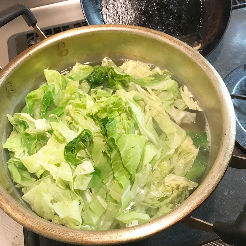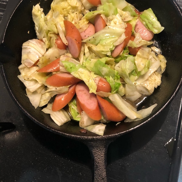 アヒージョの残りオイルでキャベツとウィンナー炒め。