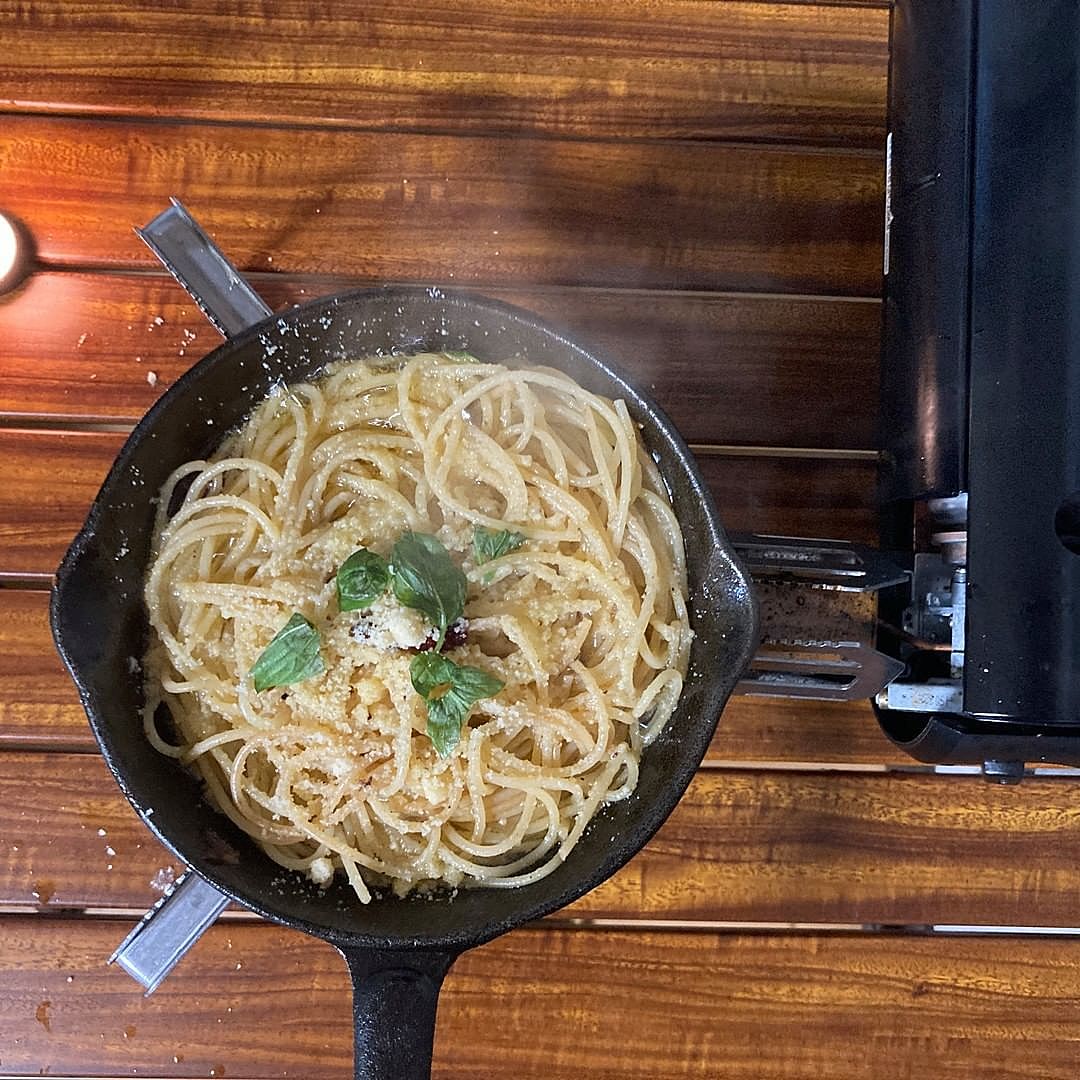 アヒージョの残りオイルでパスタ , @achiy888 ☜その他の投稿は, @sea_foodjunky さんのアヒージョ,めちゃくちゃ美味しかったのでペロリ, 魚介のエキスが出たオイルが残ったので軽くもう一品, パスタを茹でて和えただけ,ペペロンチーノみたいな感じで残した具を載せて, これまた美味い!, キャンプ場でも簡単に出来るのがありがたいですね♪,アヒージョオイルでパスタ ,。