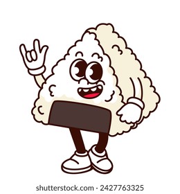 ロックバンドのジェスチャーを持つGroovyのおにぎり漫画のキャラクター。ノリのラップ とファンキーな顔と面白いレトロなライスロッカー、漫画の日本食マスコット、70年代80年代スタイルのおにぎりステッカーのベクターイラスト」のベクター画像素材 ロイヤリティフリー。