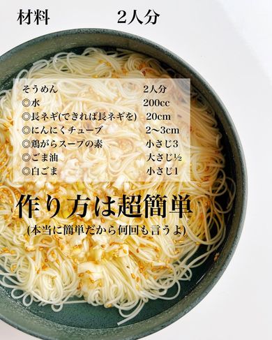 ハマごはん お手軽レシピon X: " 悪魔のラー油ネギそうめん①そうめんを茹でて冷水で冷やして水気を切る②長ネギをみじん切りにする③そうめん 、長ネギ、めんつゆ、ラー油、ごま油、にんにくチューブ、生姜チューブを混ぜたら完成! https:t.co uKLDeKhBzn"。