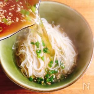 ハマごはん お手軽レシピon X: " 簡単絶品レシピ!つゆだく油そうめん①そうめんを茹でて冷水で冷やして水気を切る ②水、めんつゆ 、ごま油、ラー油、だしの素、にんにくチューブを混ぜる ③そうめんに②をかけて、白ごま、ネギ、きざみのりをのせて完成! https。