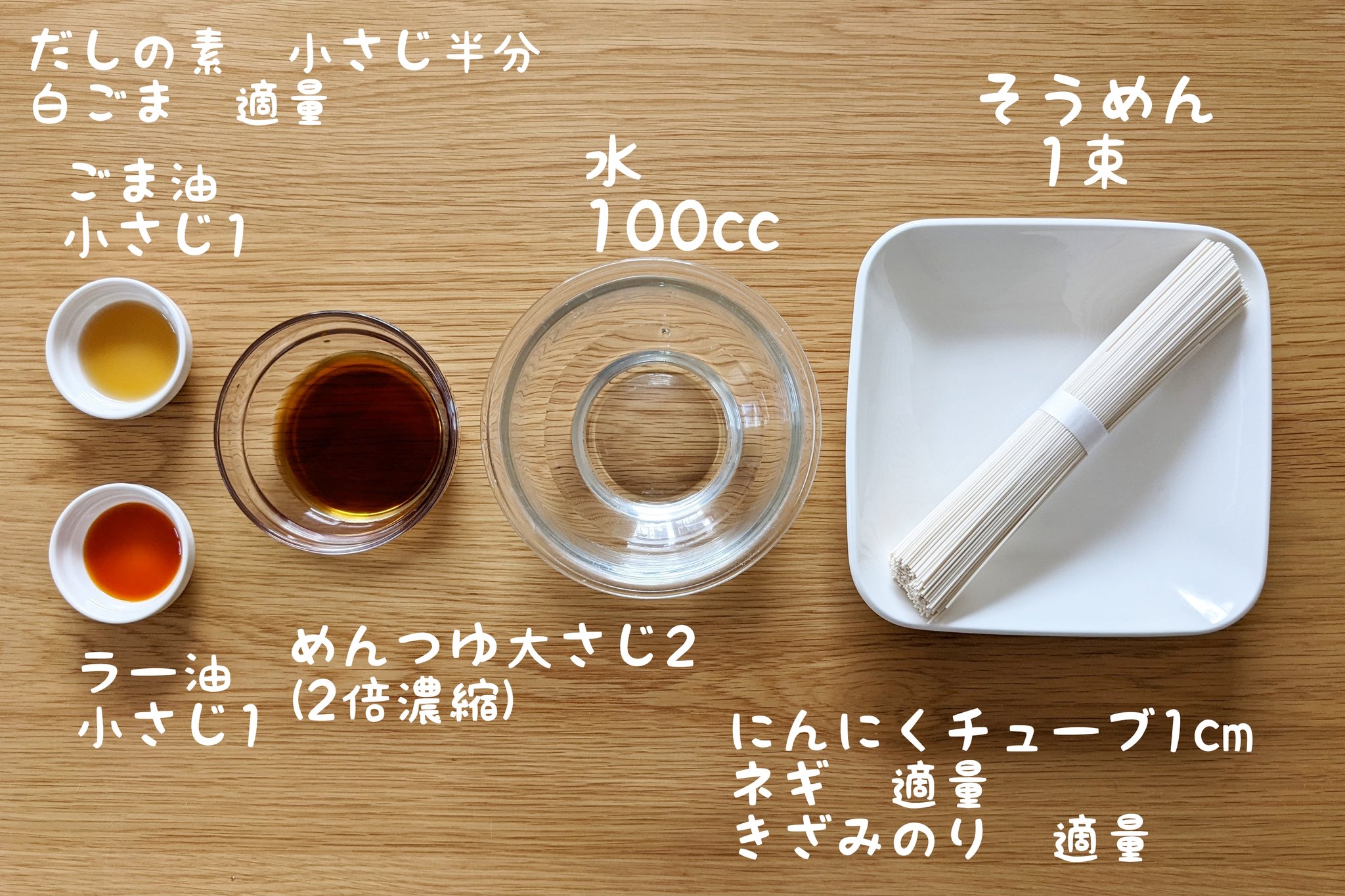 本気のめんつゆラー油そうめん,材料 , そうめん1束, 水450㏄, にんにくチューブ1㎝, 生姜チューブ1㎝, 鶏がらスープの素 小さじ1, ネギ適量, 黒胡椒適量, ラー油適量,作り方 , ①鍋に水を加えて沸騰したらそうめんを茹でる,②めんつゆ、鶏ガラスープの素、にんにくチューブ、生姜チューブを混ぜる, ③ネギをのせて、黒胡椒、ラー油を好きなだけかけたら完成!,。