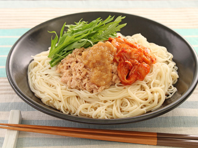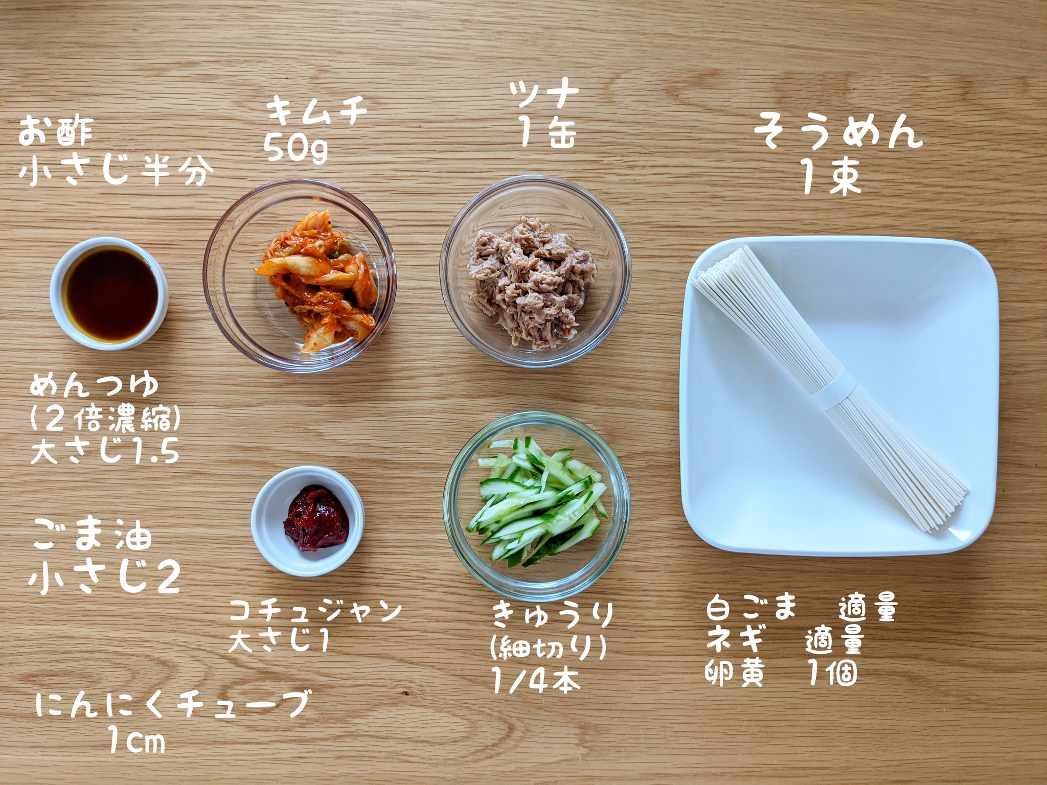 ハマごはん お手軽レシピon X: " 韓国風!ツナたまビビンそうめん①そうめんを茹でて冷水で冷やして水気をしっかりきる ②そうめん 、コチュジャン、めんつゆ、酢、ごま油、にんにくチューブを混ぜる ③そうめんの上に卵黄、キムチ、きゅうり、白ごま、ネギをのせ。