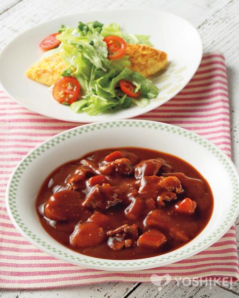 ビーフシチュー ほうれん草オムレツ サラダ添え 食材宅配のヨシケイ 夕食ネット レシピ・メニュー・献立付き。