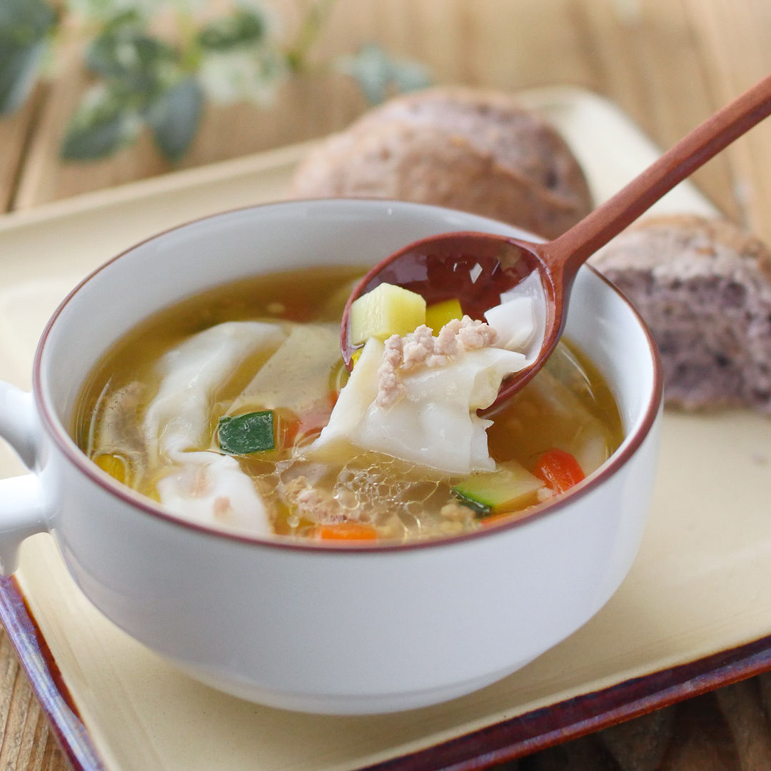 「キューピー3分クッキング」鶏肉と春雨のワンタンスープ。