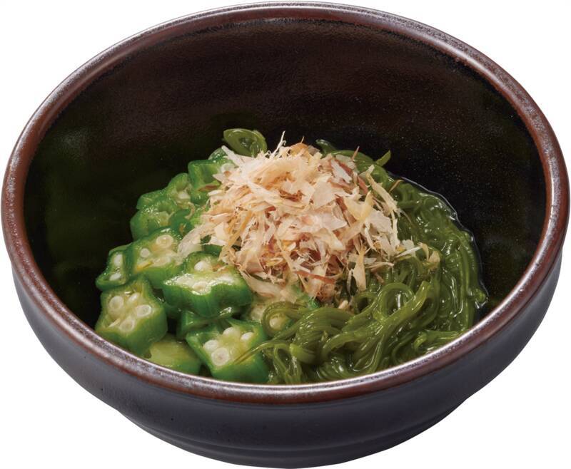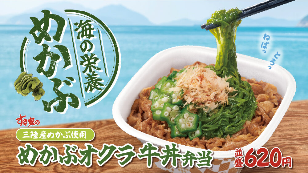 さっぱりねばとろっ! 「めかぶオクラ牛丼」 すき家の牛丼に、三陸産めかぶとねばとろ食感のオクラをトッピングした、初夏にぴったりのさっぱり牛丼が登場!昆布やカツオの旨みたっぷりの旨だし醤油がめかぶオクラと絡み、ごはんがすすむこと間違いなし! めかぶとオクラ。