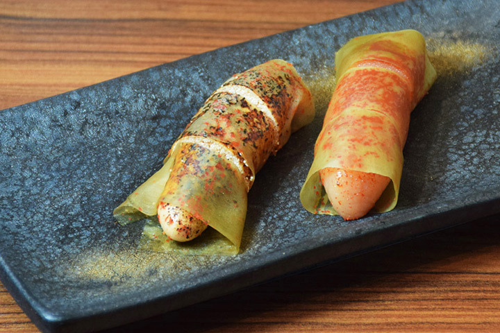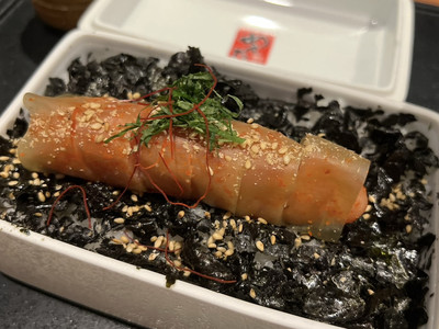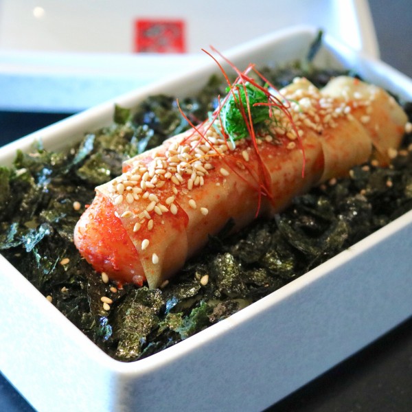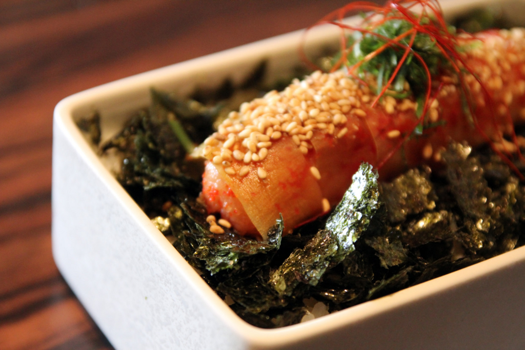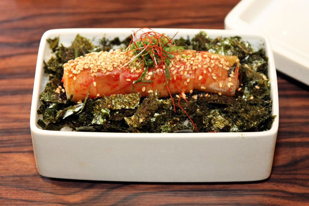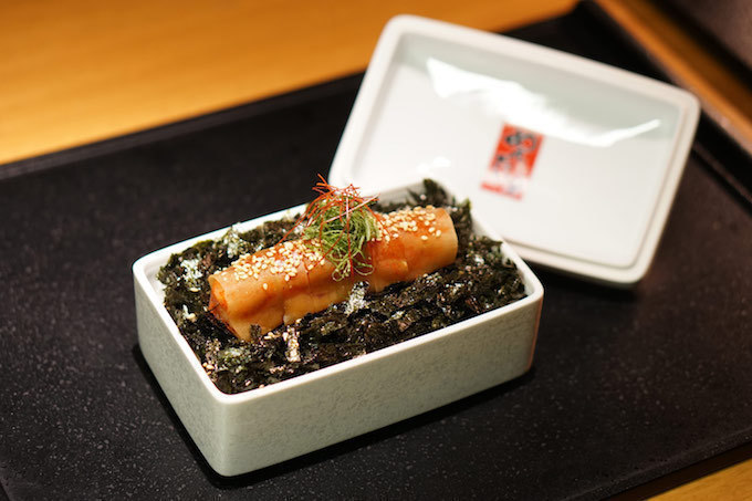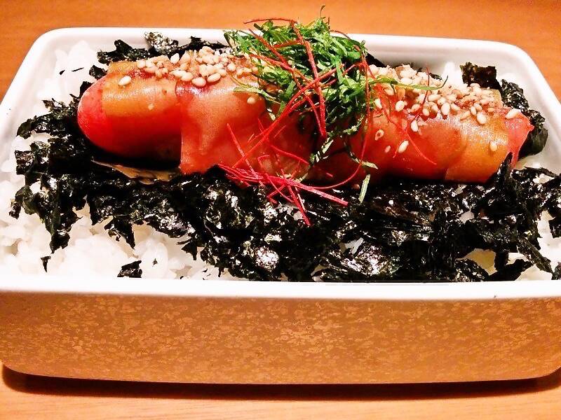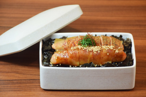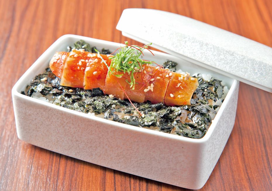 昆布で巻いためんたいこが丸々一本乗った「元祖博多めんたい重」のめんたい重 - 進化するめんたいこ㊦ 明太茶漬け、めんたい重 「すぐ食べ」に需要工場の観光施設化も - 写真・画像 1 5西日本新聞me。