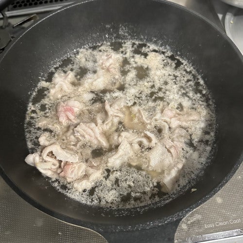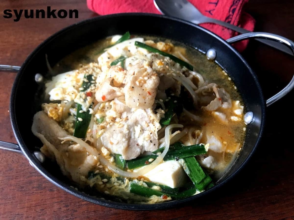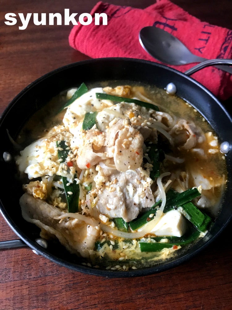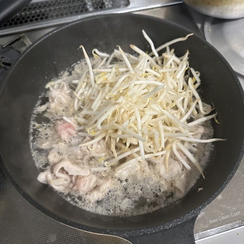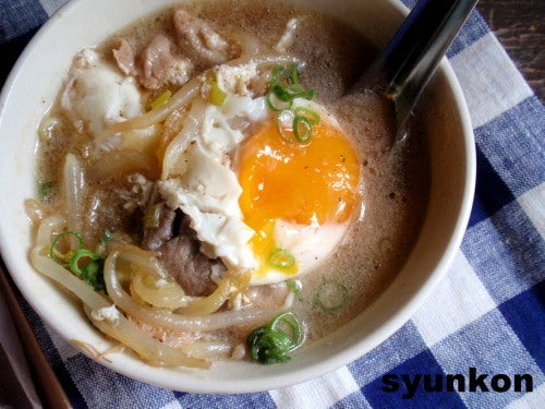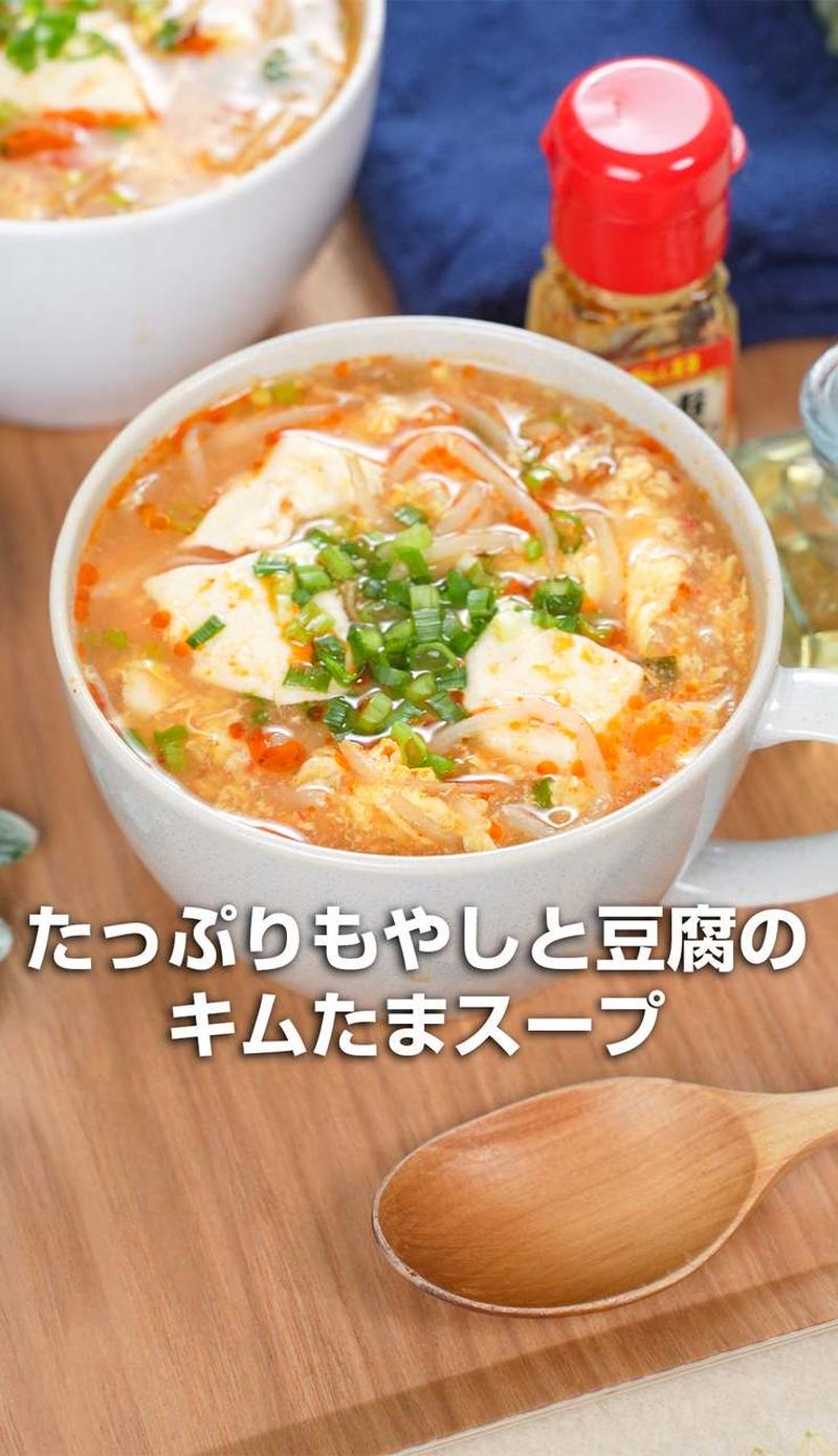 山本ゆり syunkon レンジは600Won X: " もやしとネギと豚のピリ辛卵スープ①長ネギ1 2本は斜め薄切り、にんにく1片は薄切り、豚バラ120gは食べやすく切る②フライパンに 砂糖、顆粒鶏ガラ、みそ各小2、醤油、豆板醤各小1、水600ml を沸かし①を煮る ③強火にし。