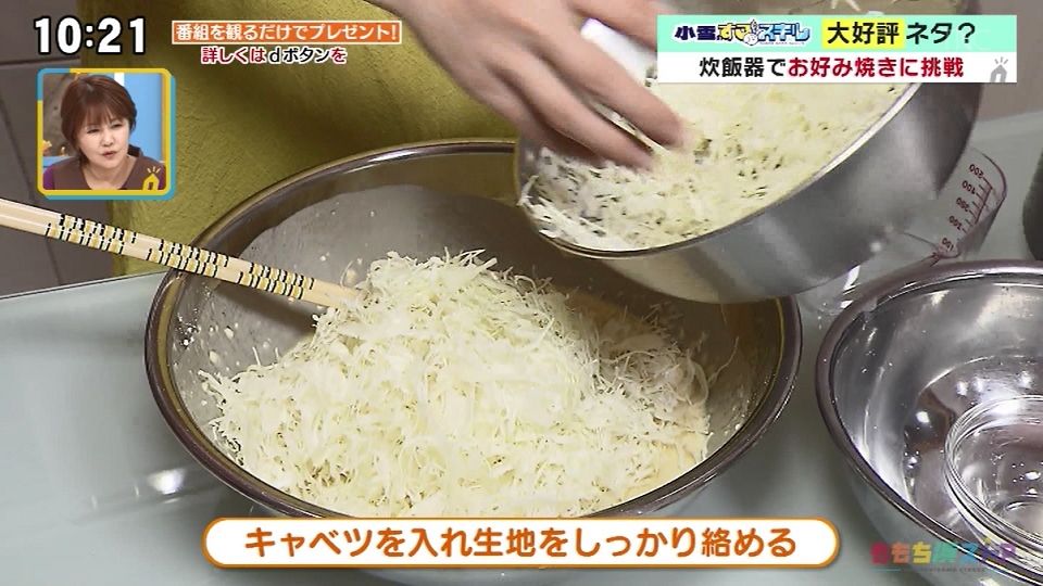 まるみキッチン 簡単レシピon X: " スイッチ1つで完成!炊飯器で巨大お好み焼き①ボウルで小麦粉250g、卵3つ、だしの素大さじ1、水450cc混ぜる ②市販の千切りキャベツ450gを投入して混ぜる ③炊飯 釜にサラダ油を適量塗ったら②を注ぎ通常炊飯 ④炊飯後にはしをさ。