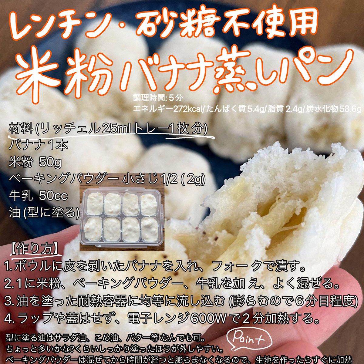 しお☺︎料理とお菓子とパン on X: " レンチン・砂糖不使用米粉バナナ蒸しパンリッチェル25mlトレーを使用した手づかみ食べにぴったりな蒸しパン🍌レンジokのものなら容器はマグカップでも紙カップでも、なんでも大丈夫です。生地が手につくなら追加で10秒ずつチンし。