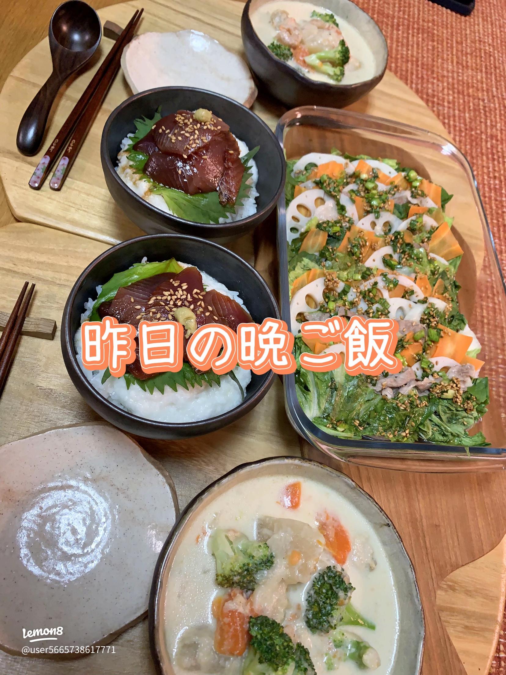 昼・夕飯献立 とろろごはん・お刺身ネギトロ丼・唐揚げ・なめ茸ひじき・作り置きおつまみ子供ごはんJ'aime les chats☀お弁当ごはん。
