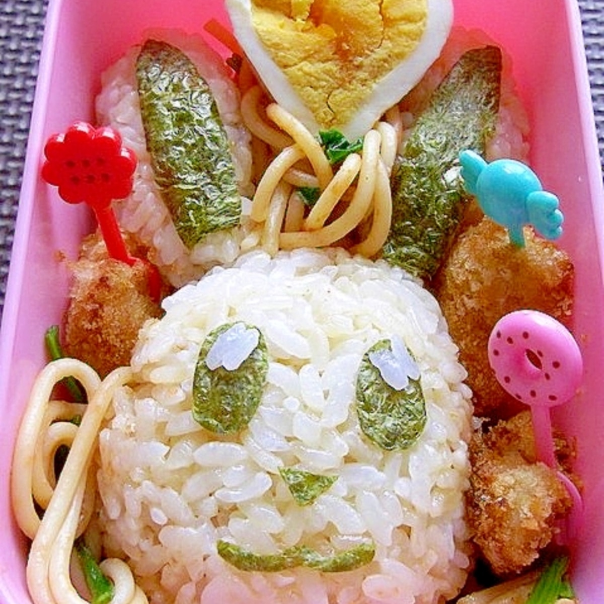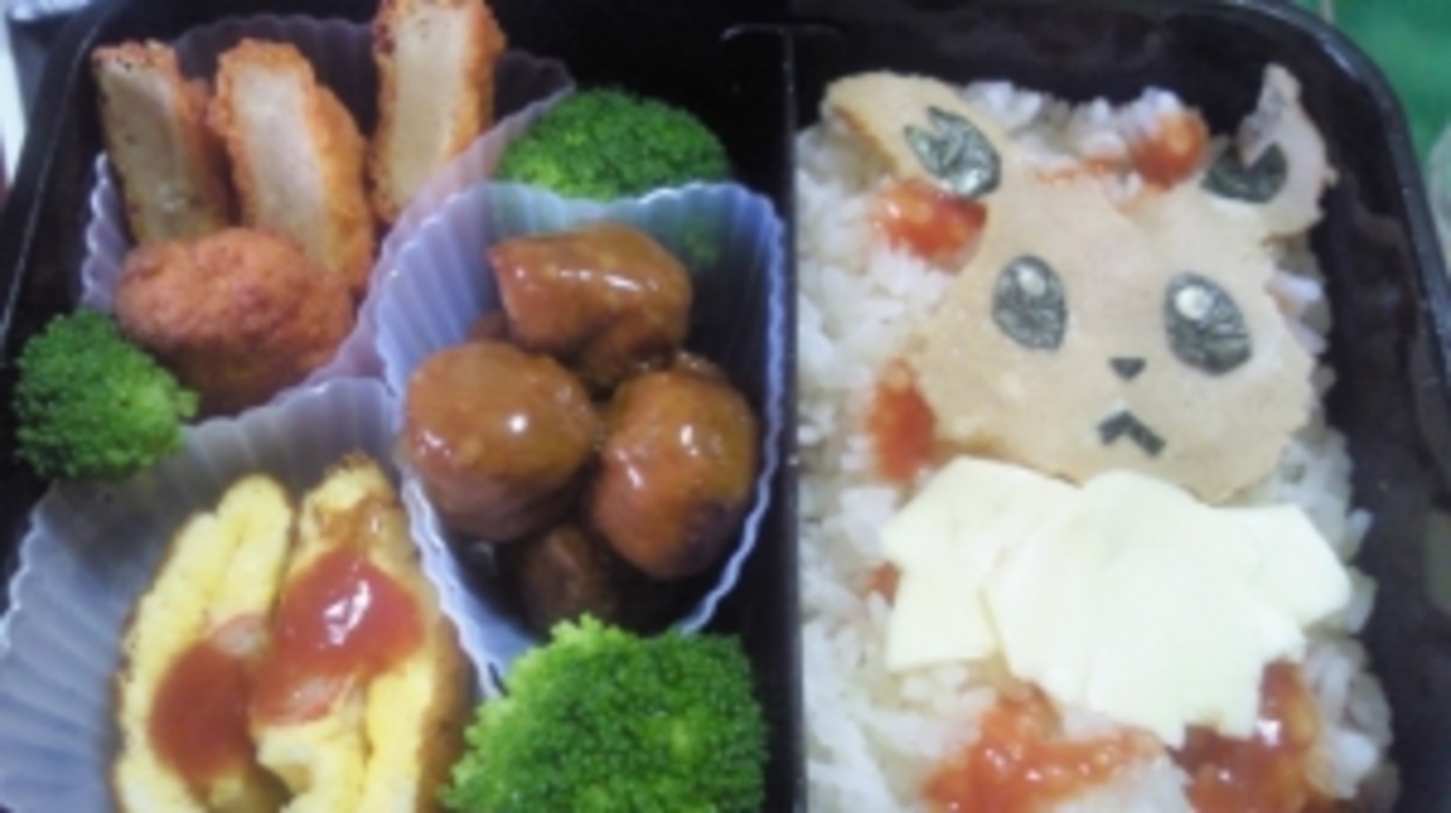 作り方詳細は本文に↓ *イーブイのお弁当*材料ごはん 適量 醤油 少々 海苔 少々 スライスチーズ 少々 乾燥パスタ 1本作り方1.ごはんをラップに包み顔、耳を握る。 2.ごはんの表面に醤油をハケで塗る。 3.お弁当箱に顔、おかずの順に詰める。耳を乾燥。