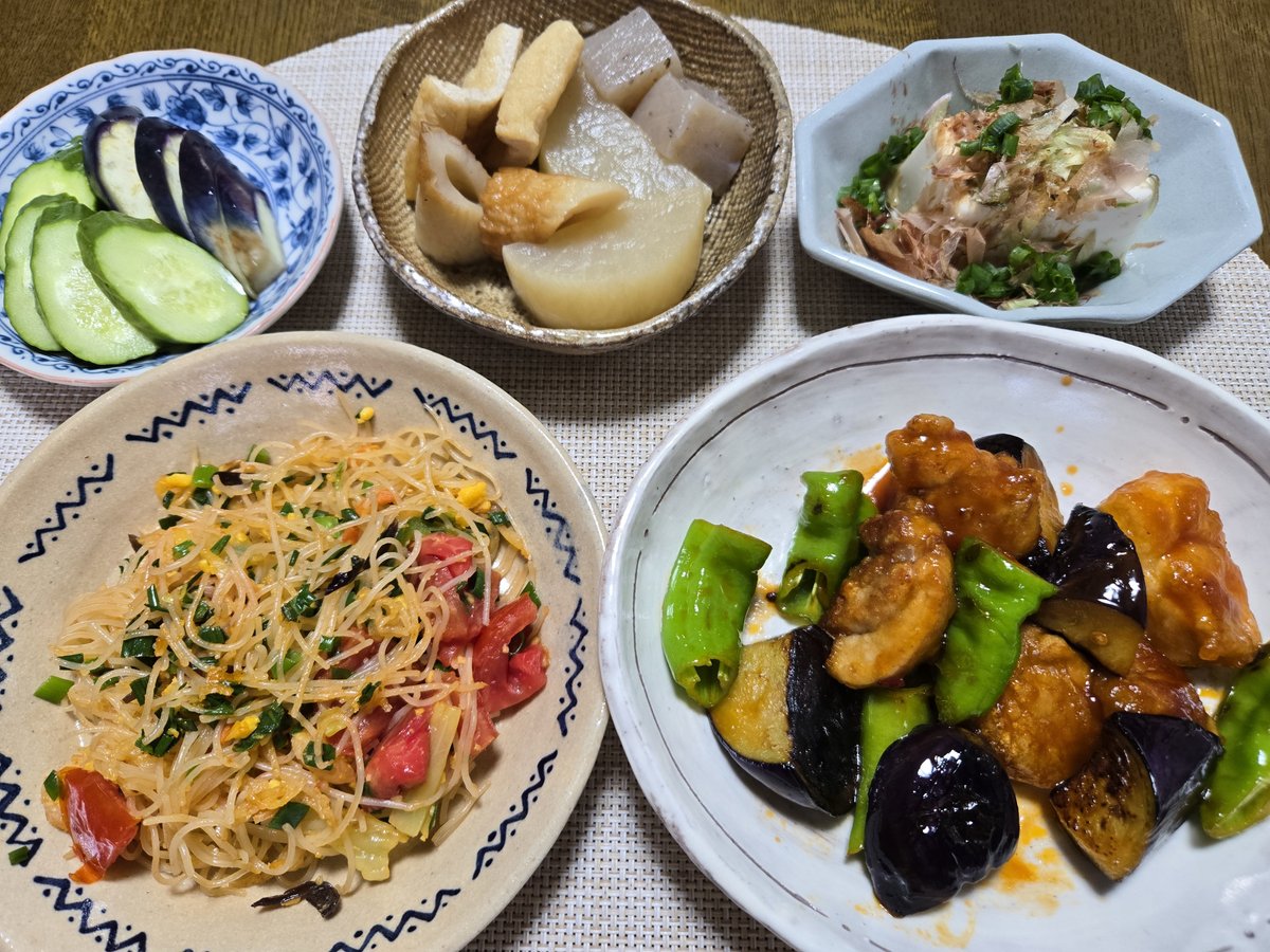 夜ご飯 📝 献立 *鶏肉と茄子の甘酢絡め ※レシピあり*ピーマンの塩昆布炒め *わかめと玉ねぎのお味噌汁 *切干大根の煮物 ※レシピあり*メロン🍈 茄子がすき🍆🤭 📝 鶏肉と茄子の甘酢絡め → トロトロの茄子とジューシーな鶏肉に 甘酢ダレが絡んでご飯がめっちゃ。