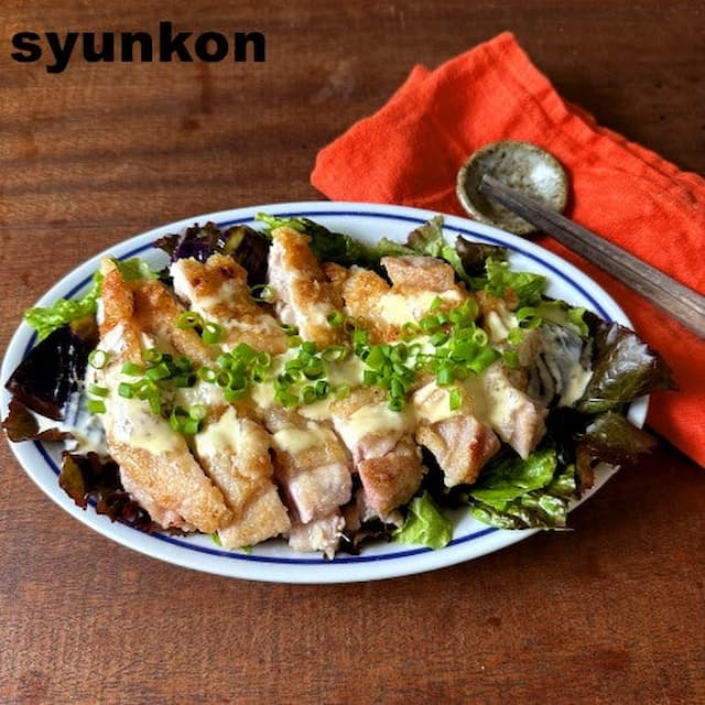 「パリパリチキンとなすの甘酢だれ新しょうがタルタル」レシピ。