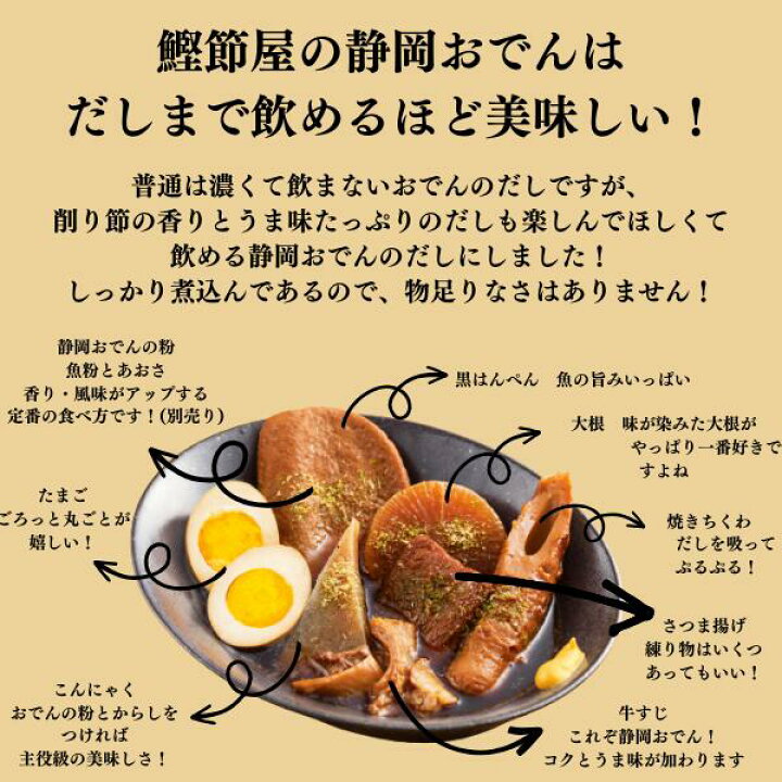 楽天市場静岡おでん しぞーかおでん だし 黒はんぺん 牛すじ 大根 ゆでたまご こんにゃく 焼きちくわ おでん 静岡土産 ご当地おでん鰹節屋がつくった贅沢静岡おでん : 堅魚屋 楽天市場店。