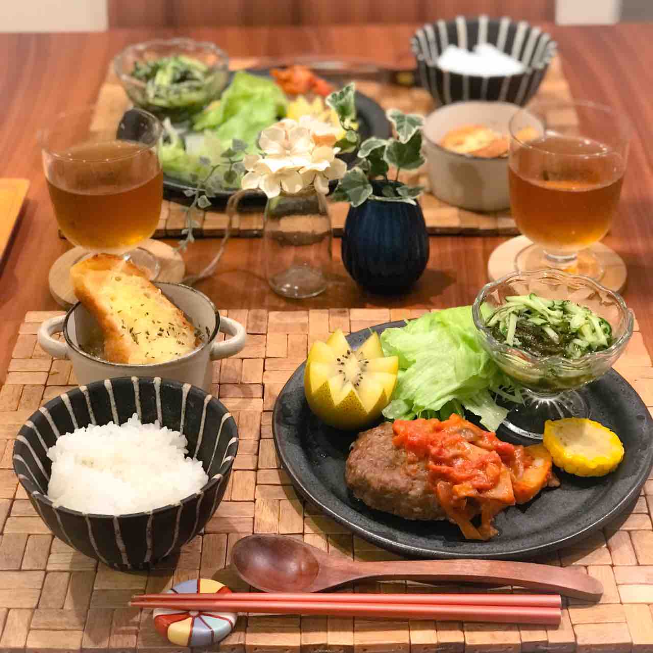 Meee ❥ ❥ゆる〜く減塩中* 献立𓂑 𓌈 ♧チーズハンバーグ ♧新玉ねぎのまるごとスープ ♧野菜サラダ ♧煮豆 ♧ごはん ♧りんご *新玉ねぎのまるごとスープ 〜2人分〜 新玉ねぎ 2個 ベーコン 2枚 短冊切りに オリーブオイル 適量 コンソメキューブ 1個 お水 300cc。