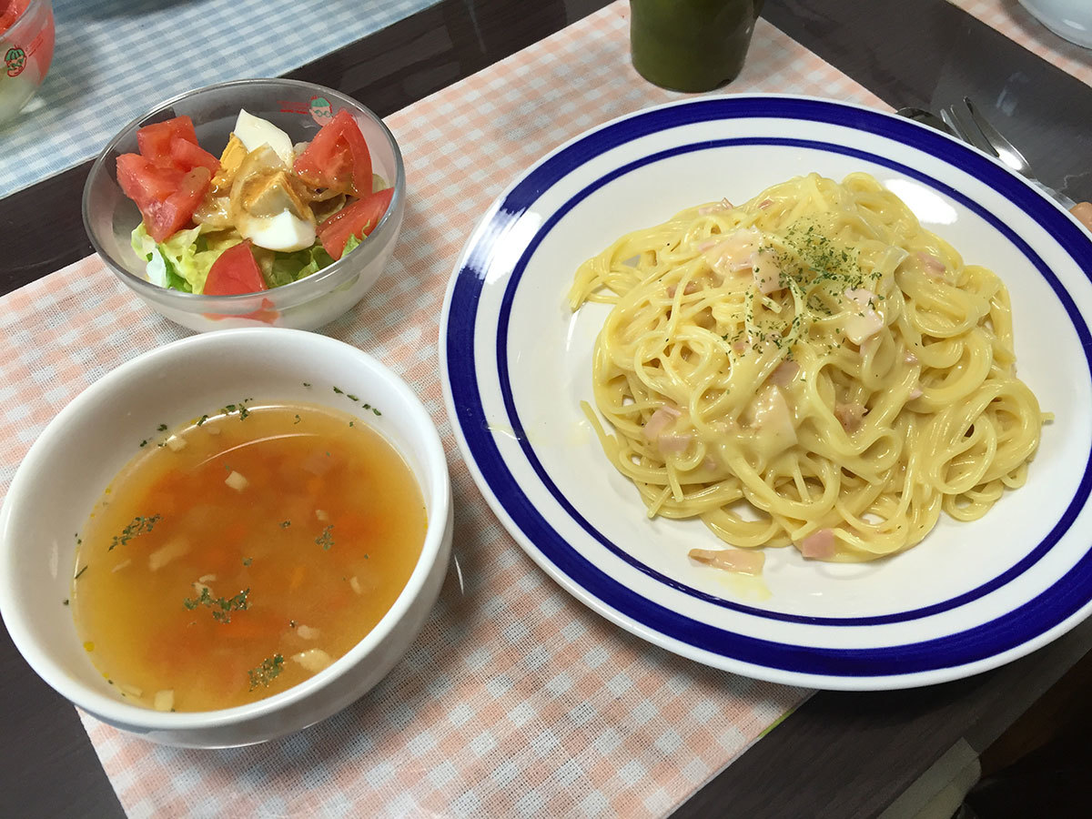 昼・カルボナーラ、オニオンスープ、サラダ : 今日の献立。
