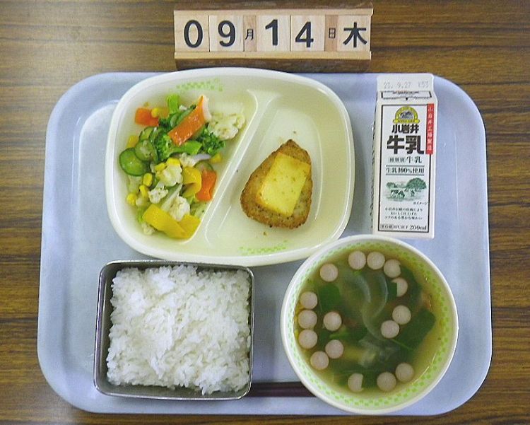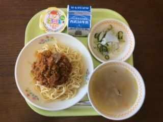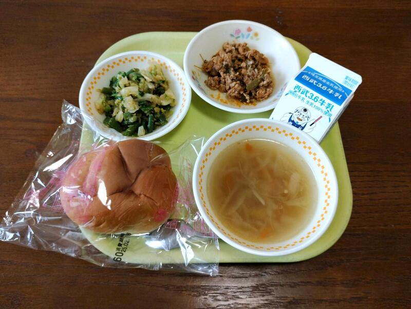 給食より10 6 月 の献立です。 食パン・魚のホワイトソースかけ・フレンチサラダ・オニオンスープ・りんごです。 おやつは、ゆかりおにぎりでした。