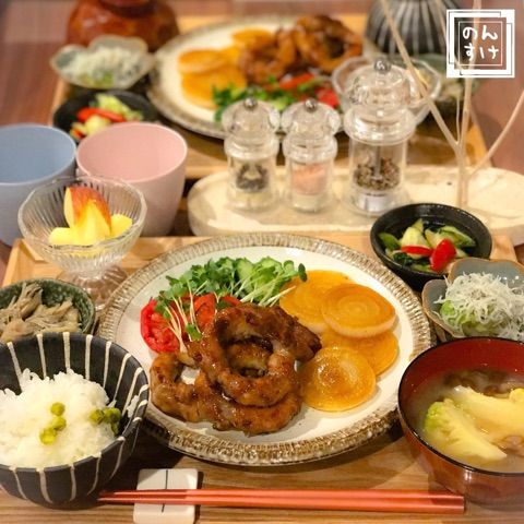 🐖🥚🌸 ・絶品てりたまアスパラ ・オニオンスープ ・ツナときゅうりのサラダ ・ハニーマスタードポテト ・ほうれん草のアーモンド胡麻和え・梅あさりの生姜佃煮 ・りんご晩ごはん夜ごはん晩ごはん献立おうちごはん献立記録。