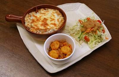 ボロネーゼなすグラタン、こんがり焼きオニオンスープeフレンズ ぱくぱく献立くん。