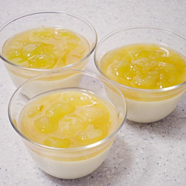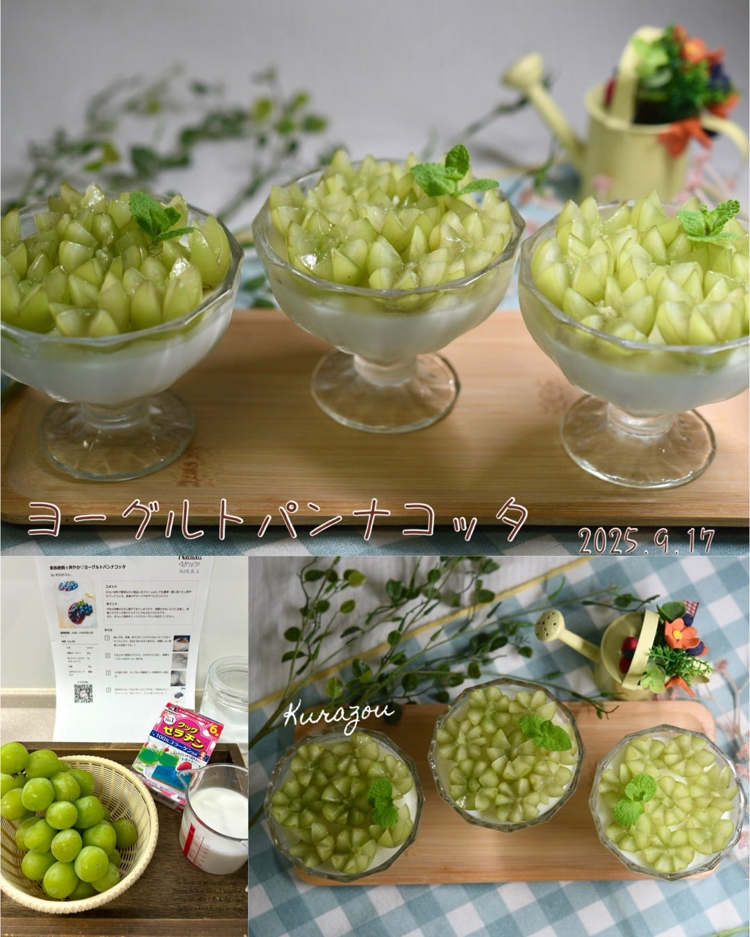 noriko2025.9.15☆ヨーグルトパンナコッタ ・ ・ フルーツいろいろ使って ヨーグルトパンナコッタ♩ 夏休みやっと帰省する息子に作っておきました。 ・ シャインマスカットは人気とおもって 写真にはないけど2個作っておいて正解。 あとはキウイ、みかん、パイン。