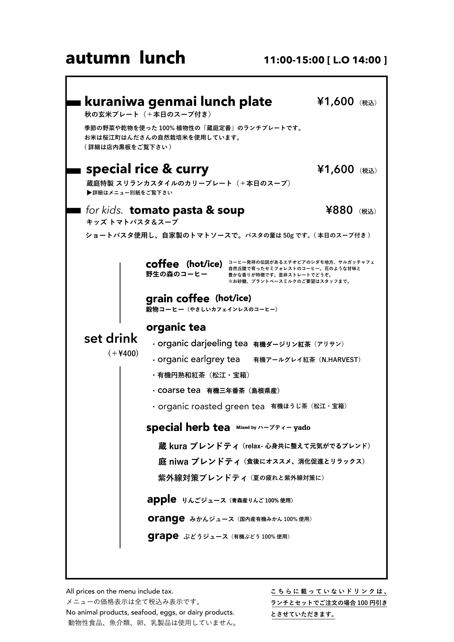 ランチメニュー」 最新のランチのメニュー表になります。 ご来店前にご確認して頂けると幸いです。近年、原材料、人件費等全てが上がっており、食材等の品質、「身体に優しい」を徹底して守るために大変心苦しいところではございますが、価格をあげております。そして。