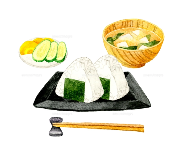 鮭おにぎり・味噌汁・漬け物 和食の手描き水彩イラスト素材のイラスト素材FYI07535368ストックフォトの QleanMarket キュリンマーケット。