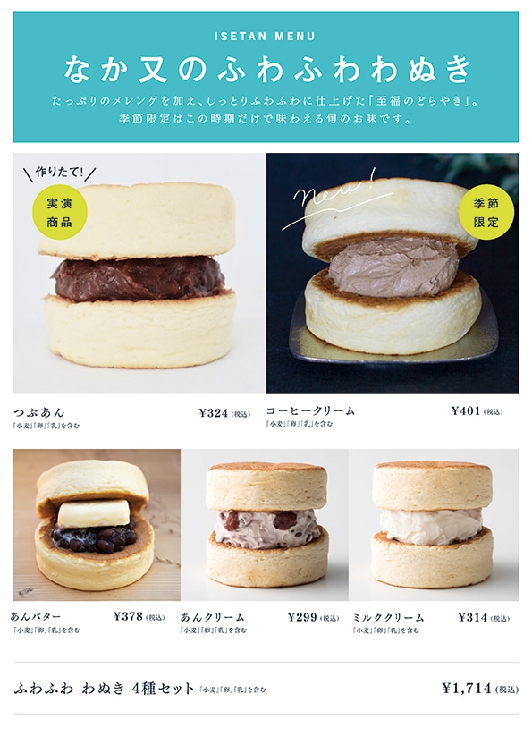 伊勢丹新宿店限定のふわふわわぬき 『ふわふわわぬき 特撰あんバター』 をはじめ、季節のふわふわわぬきも準備しております。 なか又新宿伊勢丹伊勢丹新宿お菓子。