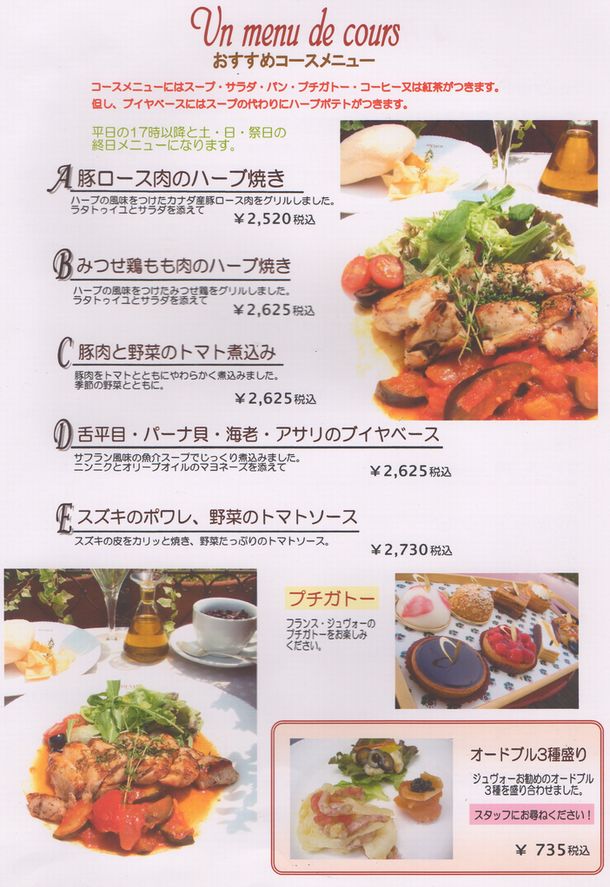 カフェジュヴォープロヴァンス二子玉川高島屋店のコースメニュー表。
