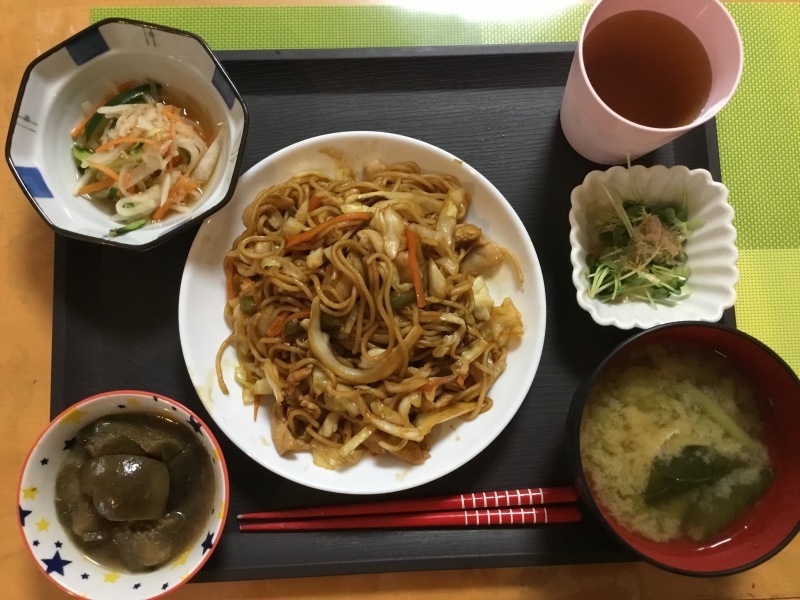 あじさい荘 夕食 ソース焼きそば 茄子の煮浸し 大根の酢の物 味噌汁 : 今日の献立。