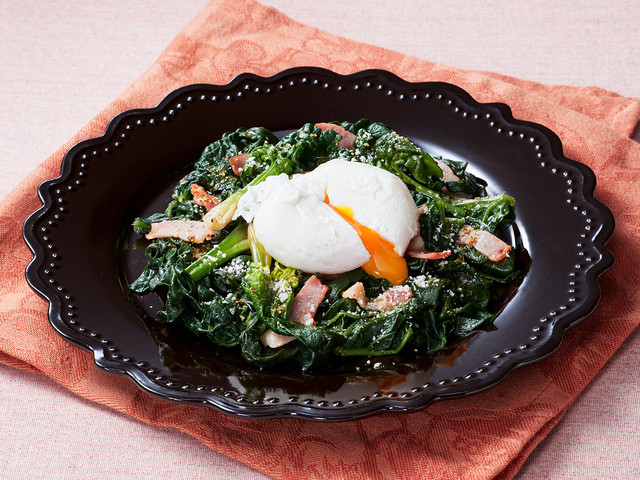 生でシャキシャキ!『ざく切り小松菜サラダ温玉のせ』のレシピオレンジページ ニュースデイリーオレンジページnet。