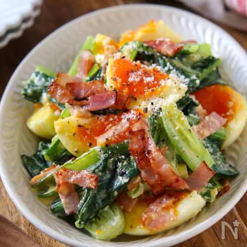 小松菜とベーコンのホットサラダヤオコーレシピ by Cooking Support。