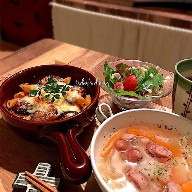 フランクフルトと皮付き野菜のポトフの献立 副菜:キノコのコンソメチン、副菜:マカロニサラダをナイスリメイク!マカロニサラダのグラタン 献立 ・メニュー 味の素パーク たべる楽しさを、もっと。