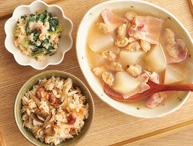 大根とあさりの和風ポトフ、鶏ときのこの炊き込みごはん、小松菜の入ったおからeフレンズ ぱくぱく献立くん。