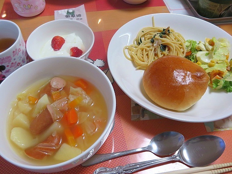 あじさい荘 朝食 ポトフ パン サラダ スープ : 今日の献立。