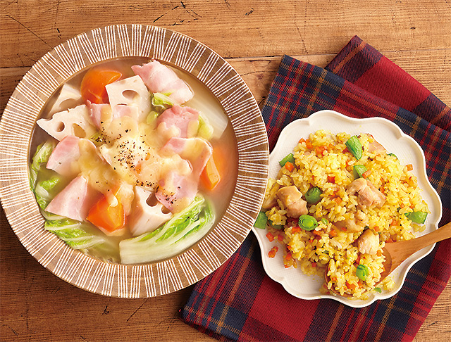 「野菜がいっぱいポトフ」&たまごケチャップライス 2人分。