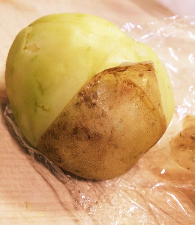 レンジでチンして熱いうちに剥く じゃがいもの皮剥き。