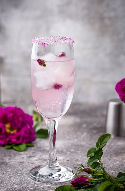 シャンパンとバラシロップのピンクのカクテルPremium写真。