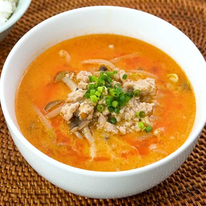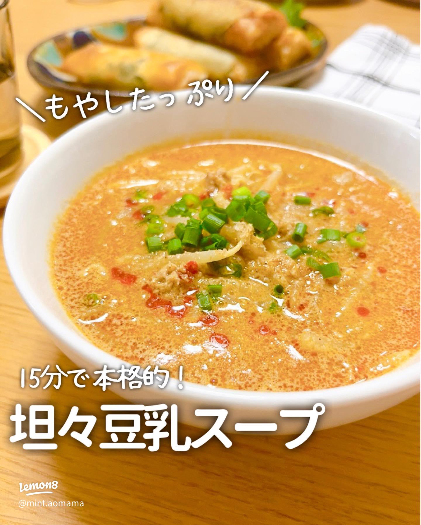 🐒詳細は↓へ🫧👍 これは天才的に旨い!!!坦々スープ✨ これは一度作ったらまた食べたくなる味です。材料も手頃なものを使用しているので、節約にも!! ねりごまなどは使用せずに、コクと旨みを引き出して風味も最高です♡ 🍓材料 2人分10分 もやし1 2袋100g 豆腐1 2丁150g 。